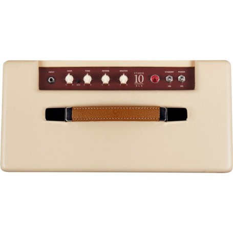 STUDIO 10 6L6 cream. Suono americano. 10 watt. Celestion Seventy 80 12 ‘speaker. Guadagno, OD, OSF, riverbero, master, standby e alimentazione. Overdrive selezionabile per canale. Riverbero appositamente progettato, uscita emulata ed effetto loop. Uscite 1×16, 1×8 e 2×16. Circuito single ended con valvola 6L6. Dimensioni: 473 x 421 x 251 mm. Peso: 17,5 Kg.