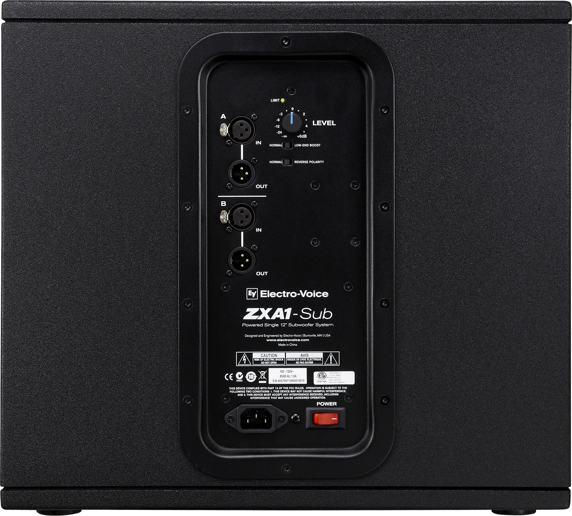 Modulo subwoofer autoalimentato progettato come rinforzo delle basse frequenze per una serie di modelli come ZXA1, ZX1, EVID ed EVU. Contenitore di forma rettangolare, costruito in compensato di betulla da 15 mm, rinforzato internamente. Include 2 maniglie per il trasporto e una staffa per l’asta del diffusore. Incorpora un diffusore da 12′ (EVS-12S), 1x modulo di potenza da 700 W. Dispone di 2 ingressi di linea (XLR), 2 uscite parallele (XLR). Controllo del livello del subwoofer, selettore BOOST per controllare l’estensione delle basse frequenze e selettore di polarità 0° – 180°. Risposta – 10 dB: 44 Hz – 118 Hz. SPL massimo: 126 dB. Dimensioni (HxLxP): 400 x 444,5 x 457,2 mm. Peso: 20,9 kg. Finitura colore nero